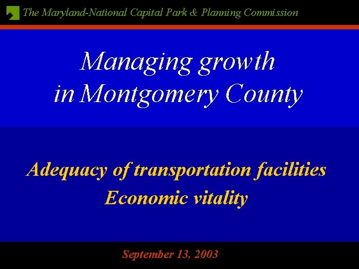 The Maryland-National Upper-case letter Park & Planning Commission Managing growth in Montgomery County Adequacy of transportation facilities Economic vitality September thirteen, 2003